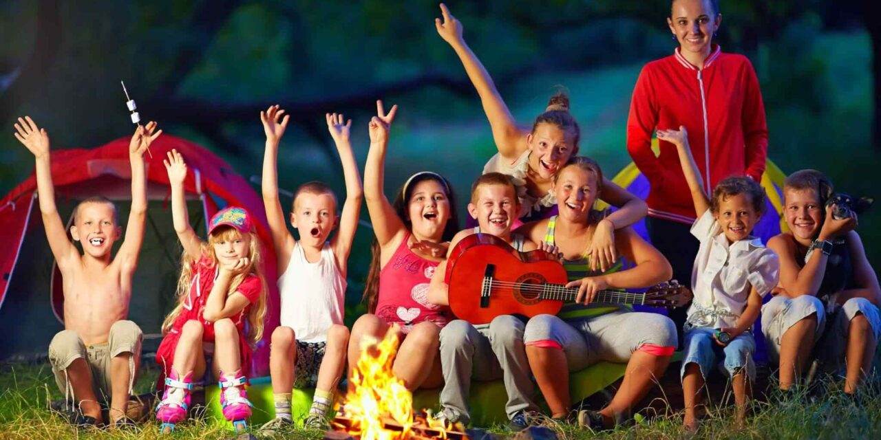 Eine Gruppe lächelnder Kinder und eine Frau sitzen in der Abenddämmerung um ein Lagerfeuer im Freien, einige heben fröhlich die Arme. Ein Kind hält eine Gitarre, und im Hintergrund sind zwischen Bäumen Zelte zu sehen.