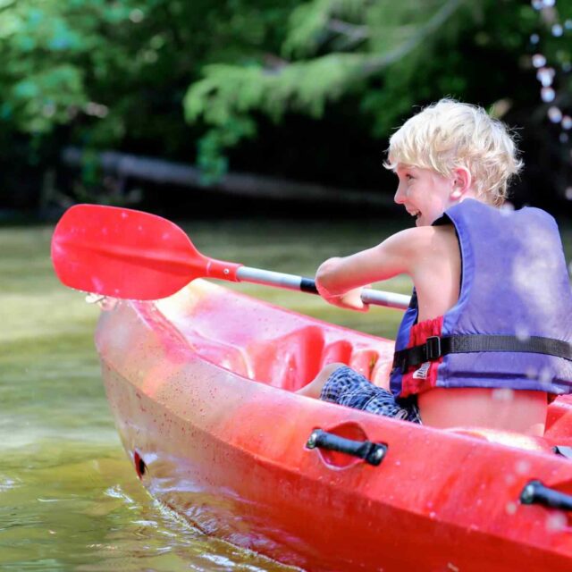 Zwei lächelnde Jungen mit blauen Schwimmwesten paddeln zusammen in einem Kajak auf einem Fluss, mit grünen Bäumen im Hintergrund. Der Junge im Vordergrund schaut in die Kamera, während der Junge im Hintergrund leicht unscharf ist.